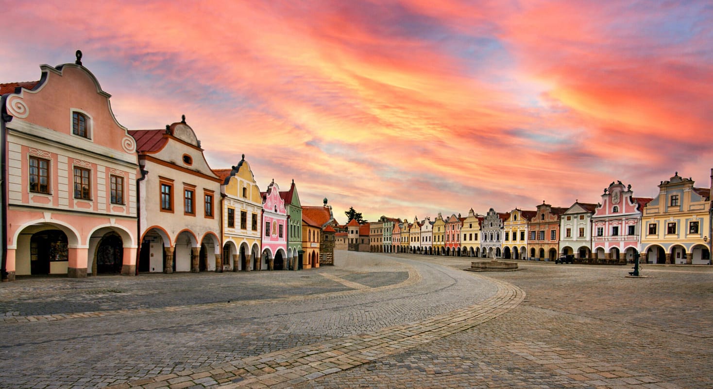 Die Altstadt von Telč sieht aus, als hätte jemand ein Märchenbuch aufgeschlagen: pastellfarbene Renaissancehäuser, ein Schloss mit Wassergraben, spiegelglatte Teiche ringsum. Kein Wunder, dass Telč UNESCO-Welterbe ist. Am Abend, wenn die Sonne untergeht, färbt sich der ganze Platz golden.