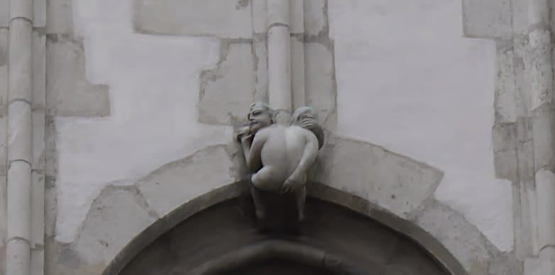 AM SÜDFENSTER DER Brünner Jakobskirche wirkt ein skulpturales Element der beeindruckenden Kirche etwas fehl am Platz: ein unanständiges Männchen mit zwei Köpfen, das frech seinen nackten Hintern der Welt zeigt.